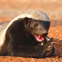 Does the honey badger have a sweet personality? No! It would be hard to find a more quarrelsome animal than the honey badger. It doesn’t start fights it can’t finish, and it makes an impressive foe. Also, the honey badger's skin is tough and loose, allowing the animal to twist around and bite an opponent that has grabbed it by the back of its neck. Combine that with a massive skull, strong teeth, and that awful odour, and you have an animal nobody wants to mess with!